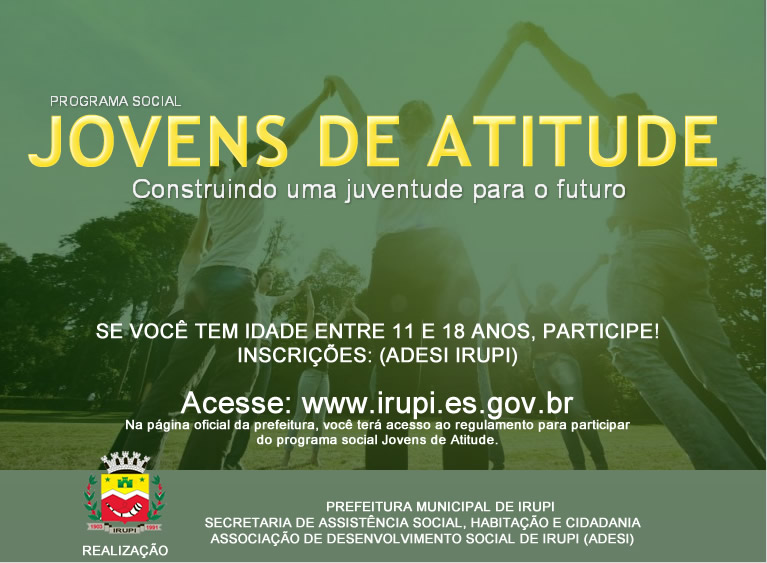A Prefeitura Municipal de Irupi, por meio da Secretaria de Assistência Social, Habitação e Cidadania e Adesi-Irupi, lança o programa social Jovens de Atitude com o intuito de desenvolver ações sociais dirigidas a jovens e adolescentes prevenindo o envolvimento com ações violentas.
