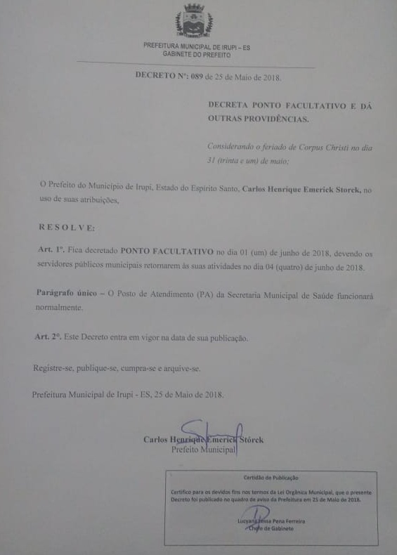 Por conta do feriado de Corpus Christi, nesta quinta-feira, 31 de maio, a Prefeitura de Irupi decretou ponto facultativo nas repartições públicas municipais na próxima sexta-feira (01) de junho. As atividades da prefeitura retornam normalmente na segunda-feira (04). Durante o período, funcionarão normalmente os serviços considerados essenciais.