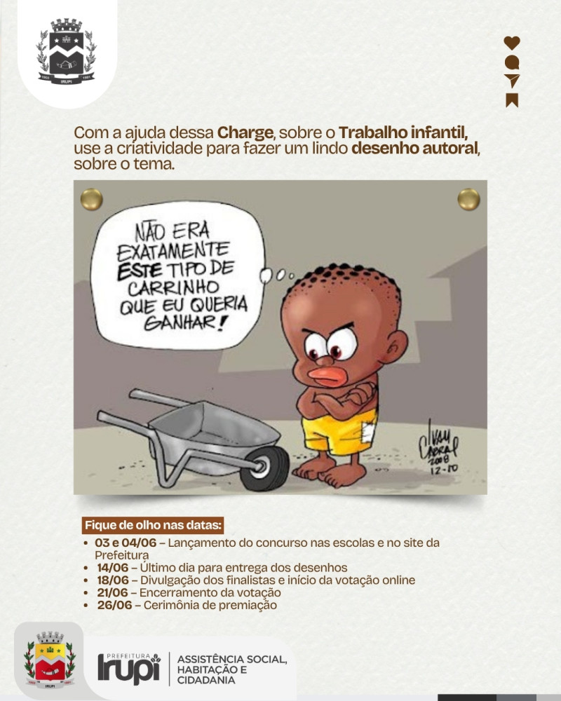 A Prefeitura de Irupi, por meio da Secretaria de Assistência Social, Habitação e Cidadania, junto com o CREAS e o Conselho Tutelar, está promovendo durante o mês de junho uma ação muito importante: o Concurso de Desenhos com o tema “Trabalho Infantil”.